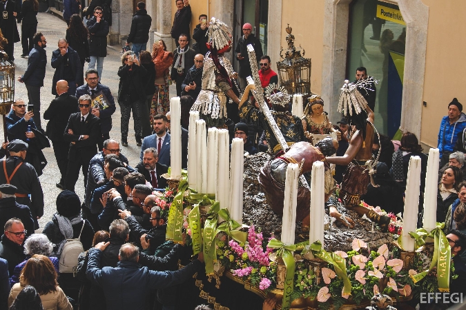 Per il resto è stato un po’ tutto troppo schematizzato per entrambe le processioni: le battute con la musica limitate quasi totalmente davanti le sedi dei ceti, la presenza di troppi vistosi cordoni al collo da parte degli appartenenti all’Unione dei Massari, e che danno troppa pomposità a discapito della semplicità, la prima parte della processione della Pietà del popolo che sembrava più una corsa per le strade che una processione, ed infine, per entrambe, l’assenza di candele di cera da parte dei processionanti, anche se questa è una cosa che accade da un po’ di tempo, purtroppo, perché alle candele di cera, vengono preferiti degli inutili bastoni o porta candele elettriche che tolgono bellezza e storicità.