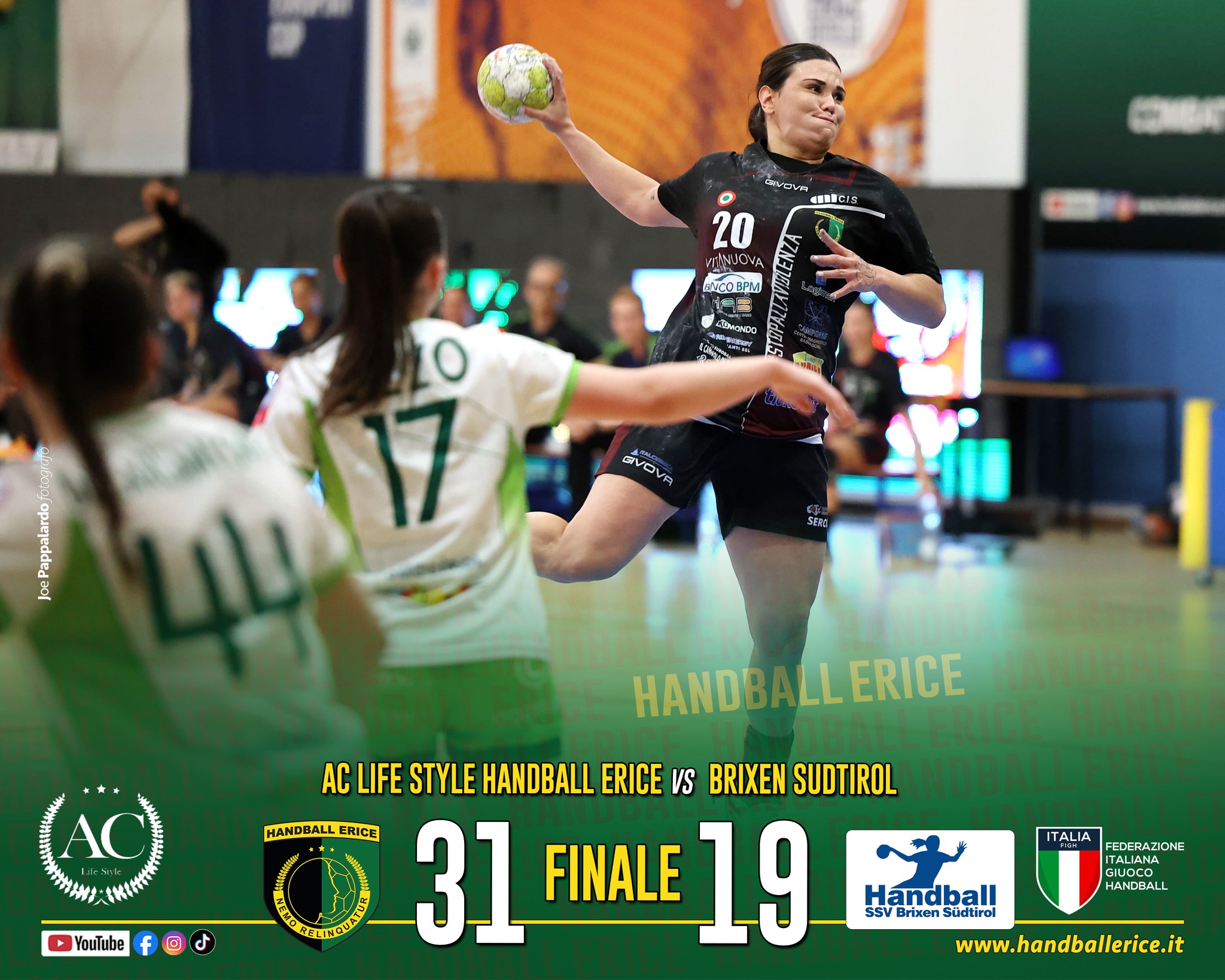 • Pallamano: AC Life Style Handball Erice-Brixen 31-19, le Arpie non si fermano più. Era una gara senza alcun significato di classifica, eppure non sono mancati spettacolo e combattività, in sessanta minuti ben giocati e avvincenti. Il coach Cristina Cabeza Gutiérrez lascia a riposo Laeticia Ateba e Alexandrina Cabral Barbosa, lanciando nella mischia Maxime Struijs e Alexandra Do Nascimento (entrambe si riveleranno tra le migliori). Da domani, sarà testa solo ai playoff. Questo lo score dell'AC Life Style Handball Erice: Bernabei 2, Eghianruwa 4, Tarbuch 4, Losio 1, Cozzi 1, Struijs 2, Do Nascimento 7, Benincasa, Iacovello, Dalle Crode 6, Di Prisco 2, Pessoa 2, Pinto Pereira, Ramazzotti. All. Cristina Cabeza Gutiérrez. E adesso, rimane solo da coronare la terza partecipazione consecutiva ai playoff, raggiungendo l’obiettivo finora sfuggito. Martina Iacovello (portiere AC Life Style Handball Erice): “Siamo consapevoli di aver giocato un’ottima partita. Sono rimasta in campo per buona parte del secondo tempo e sono felice di aver dato il mio contributo alla squadra. È stato il modo migliore per avvicinarci ai playoff, che naturalmente rimangono il nostro obiettivo unico. Faremo di tutto per regalare la massima soddisfazione al nostro club, ai nostri tifosi ed alla città".