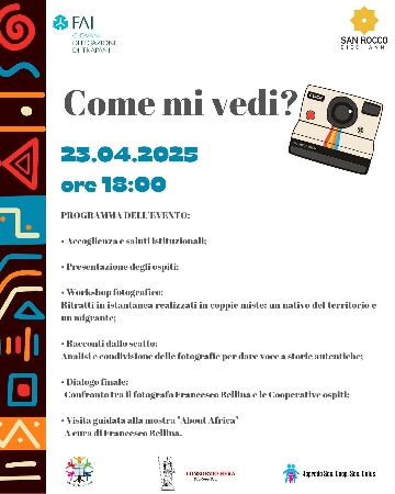 In occasione della chiusura della mostra, il gruppo FAI Giovani di Trapani organizza l'evento "Come mi vedi?" che prevede la realizzazione di ritratti fotografici in coppie miste, composte da un nativo del territorio e un migrante. L’iniziativa sarà seguita da un dibattito pubblico, al quale parteciperanno Francesco Bellina, la Cooperativa Liberi di Intrecciare, il Consorzio Hera e Approdo Soc. Coop. Soc. Onlus, per discutere il ruolo della percezione e della rappresentazione dell'altro, affrontando anche temi legati all'accoglienza e all'integrazione.