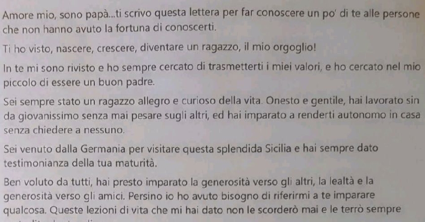 Parole strazianti, in cui il papà ripercorre la breve ma intensa vita di Leonardo, un ragazzo pieno di curiosità e gentilezza, cresciuto tra la Germania e la Sicilia, capace di rendersi autonomo fin da piccolo e di farsi voler bene da tutti. "Ti ho visto nascere, crescere, diventare un ragazzo, il mio orgoglio", scrive Giacomo Titone, che nella lettera racconta di aver imparato tanto da suo figlio: "Persino io ho avuto bisogno di riferirmi a te per imparare qualcosa. Queste lezioni di vita non me le scorderò mai".