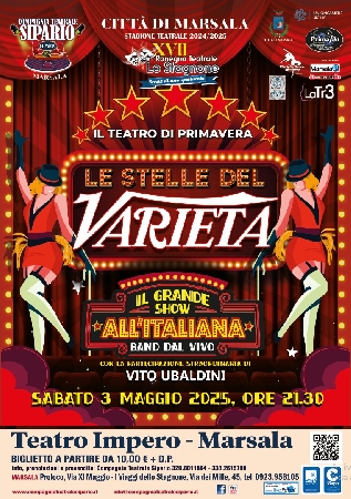 Sabato 3 maggio alle 21:30, il Teatro Impero di Marsala ospiterà uno spettacolo di arte varia dal titolo “Le Stelle del Varietà – Il grande Show all’italiana”, il gran finale della XVII Rassegna Lo Stagnone scene di uno spettacolo, organizzata dalla Compagnia teatrale Sipario.