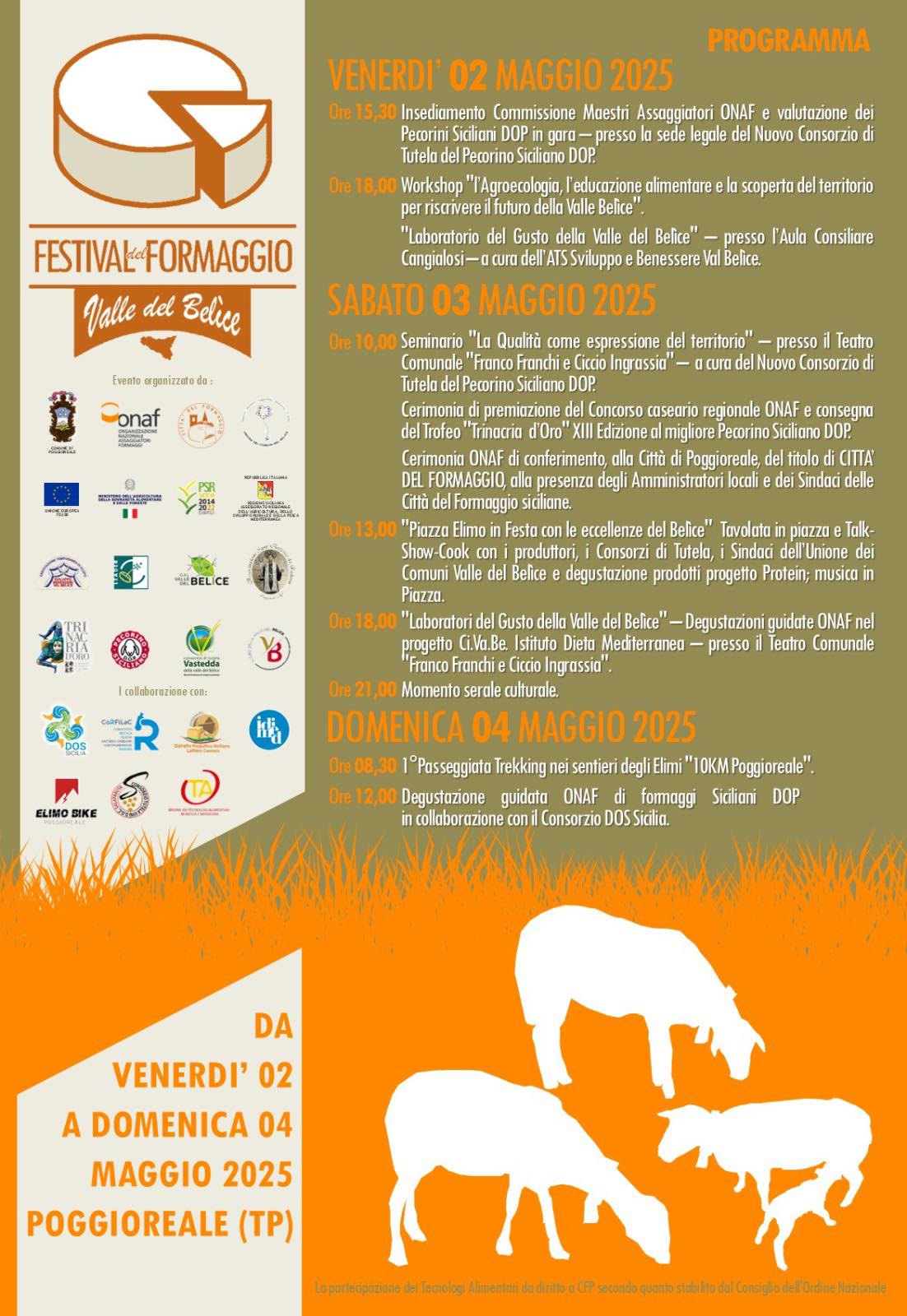 POGGIOREALE - Fino al 4 maggio a Poggioreale si svolge il Festival del Formaggio Valle del Belìce, con degustazioni ONAF, show-cooking, seminari, laboratori del gusto e una passeggiata trekking tra i sentieri degli Elimi. L’evento celebra il Pecorino Siciliano DOP e promuove la cultura agroalimentare locale. Sabato alle 13:00 “Piazza Elimo in Festa” con produttori, consorzi e talk show. Domenica alle 12:00 degustazione guidata dei formaggi siciliani DOP.