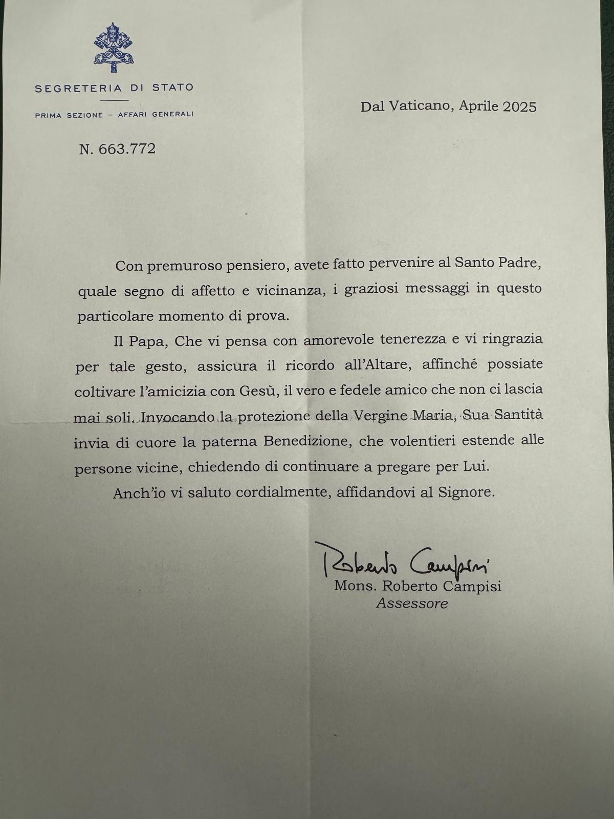 Dopo averli raccolti li ho inviati insieme a una lettera che esprima la vicinanza di tutta la comunità parrocchiale. Oggi è arrivata dalla Santa Sede la risposta che è partita da Roma proprio il 21 aprile, giorno della morte di Papa Francesco. L’ho aperta con commozione ho aperto leggendola insieme ai parrocchiani che erano presenti. La conserveremo gelosamente – dice - Sono certo che i nostri bambini non dimenticheranno questo momento”.