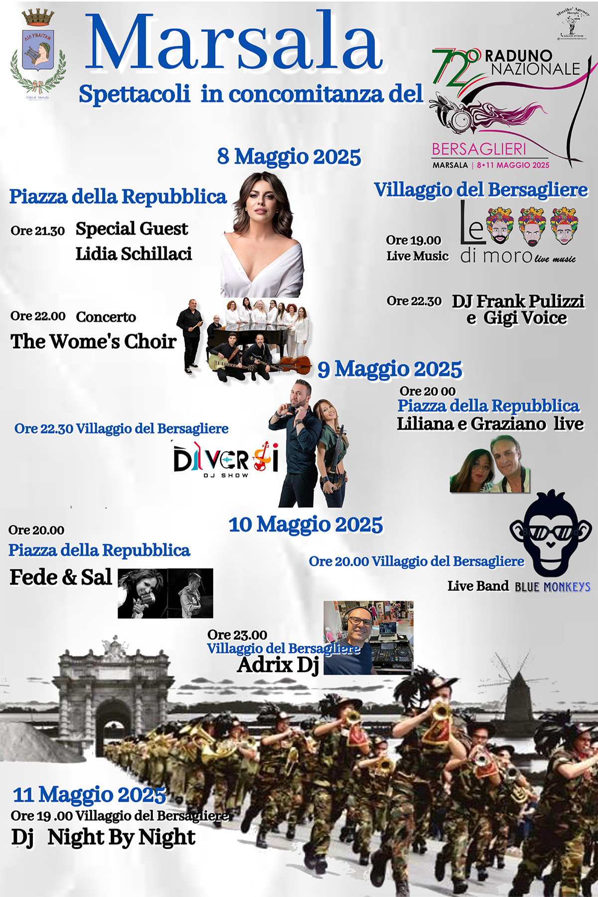 Sabato 10 maggio : La giornata inizia alle ore 9:30 presso il Complesso San Pietro con la cerimonia di premiazione del concorso d’idee “Il Bersagliere: baluardo dei valori di civiltà a tutela della pace e della libertà”. Un’occasione per celebrare l’impegno creativo e riflessivo sul significato contemporaneo del bersagliere. Alle 10:30, un’anticipazione musicale emozionante sarà offerta dalla fanfara di Lonate Pozzolo, con una piccola esibizione tra Via Garibaldi e Piazza della Repubblica, che precederà la Santa Messa celebrata alle ore 11:00 nella splendida cornice della Chiesa Madre. Dopo la funzione religiosa, alle 12:00, la stessa fanfara tornerà in Piazza della Repubblica per un’ulteriore breve esibizione. A partire dalle 14:00 e fino alle 20:00, Piazza della Repubblica ospiterà l’Annullo Postale commemorativo, un momento speciale per collezionisti e appassionati. Nel pomeriggio, alle ore 16:00, il momento solenne degli Onori ai Caduti presso la Cappella Militare del cimitero cittadino vedrà la deposizione di una corona commemorativa, in ricordo dei bersaglieri che hanno sacrificato la vita per la Patria. Alle ore 17:00, lo Stadio Municipale sarà teatro di un coinvolgente saggio ginnico militare coordinato dal 6° Reggimento Bersaglieri di Trapani, offrendo una spettacolare dimostrazione di disciplina, coordinazione e tradizione militare. Dalle 19:00, le vie delle contrade e del centro urbano saranno animate dalle vibranti note delle fanfare itineranti, regalando a cittadini e visitatori atmosfere festive e coinvolgenti. C.da Bambina – C.da San Leonardo – C.da Matarocco – C.da Santo Padre delle Perriere – C.da Borgo Misilla – C.da Digerbato. In serata, alle ore 21:00, tre luoghi simbolici della città si animeranno contemporaneamente con le straordinarie esibizioni delle fanfare: Centro urbano
