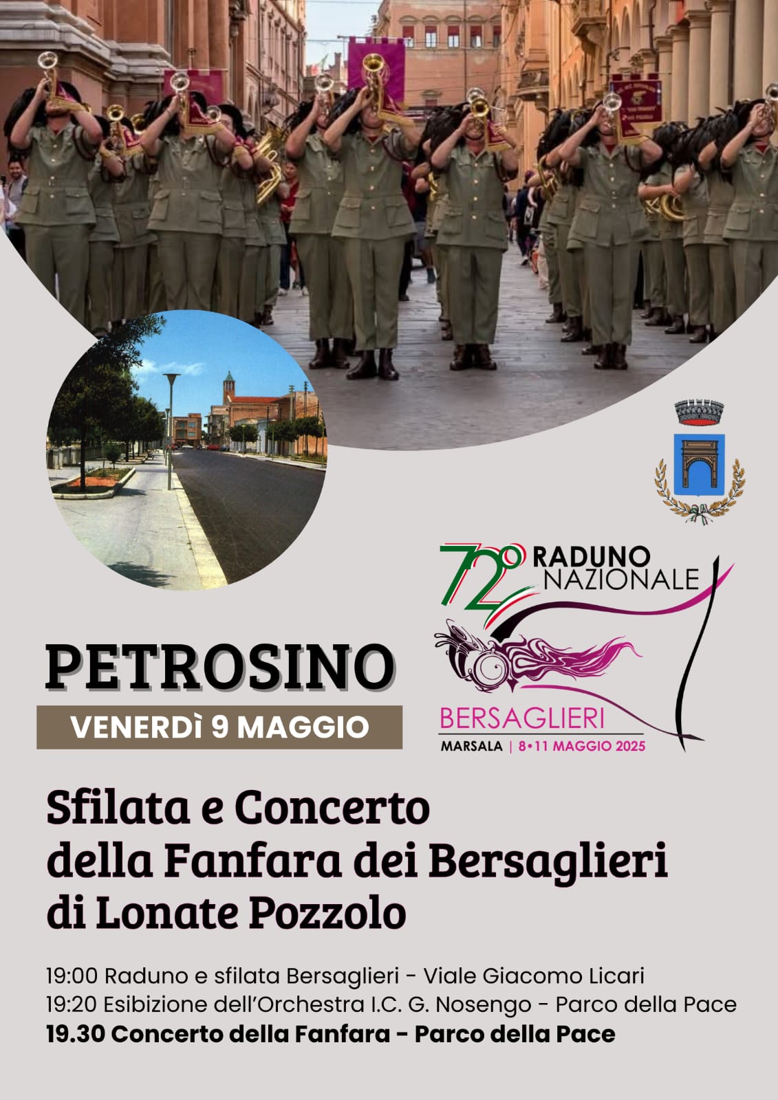 Petrosino - In occasione del 72° Raduno Nazionale dei Bersaglieri che si terrà a Marsala, Petrosino è lieta di ospitare un appuntamento speciale: Venerdì 9 Maggio, la prestigiosa Fanfara dei Bersaglieri di Lonate Pozzolo farà tappa nel nostro territorio per un momento di grande coinvolgimento e valore simbolico.