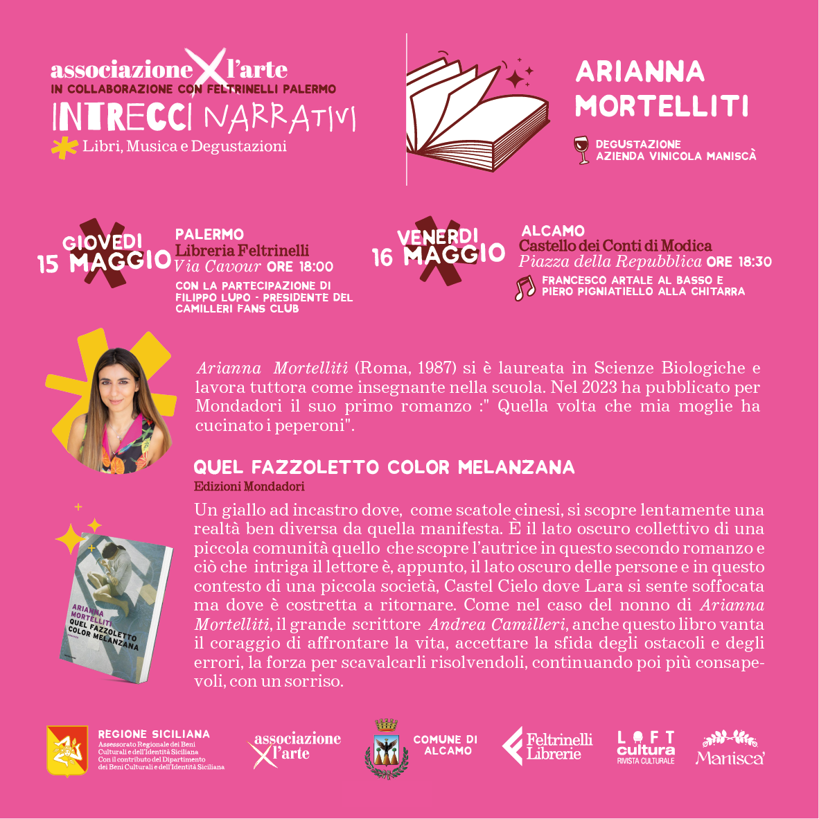 Quattro gli incontri letterari della prima fase primaverile (la rassegna continuerà anche in autunno) quest’anno programmati al Castello dei Conti di Modica ad Alcamo, e alla Libreria La Feltrinelli a Palermo, che si concluderanno a fine giugno, secondo il seguente calendario: - Giovedì 15 maggio alle ore 18:00 a Palermo e venerdì 16 maggio alle ore 18:30 ad Alcamo con Arianna Mortelliti che presenterà “Quel fazzoletto color melanzana”, Edizioni Mondadori - Giovedì 29 maggio alle ore 18:00 a Palermo e venerdì 30 maggio alle ore 18:30ad Alcamo con Enrico Deaglio che presenterà “C’era una volta in Italia”, Edizioni Feltrinelli - Giovedì 12 giugno alle ore 18:00 a Palermo e venerdì 13 giugno alle ore 18:30ad Alcamo con Alberto Grillo che presenterà “Un’estate da Dick Fulmine”, Edizioni Laurana - Sabato 28 giugno alle ore 18:00 a Palermo e venerdì 27 giugno alle ore 18:30 ad Alcamo con Giuseppe Lupo che presenterà “Storia d’amore e macchine da scrivere”, Edizioni Marsilio. La prima autrice in Rassegna, Arianna Mortelliti, nipote del celebre Andrea Camilleri, si è laureata in Scienze biologiche e lavora tuttora come insegnante nella scuola.