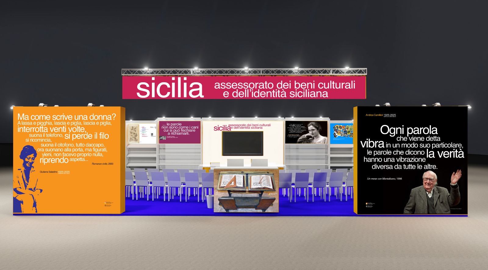 Il tema portante dell’edizione 2025 del Salone, “Le parole tra noi leggere”, ispira anche la proposta della Regione Siciliana, che omaggia il potere delle parole attraverso una grafica evocativa e le citazioni tratte dai capolavori di grandi autori siciliani: da Horcynus Orca di Stefano D’Arrigo a L’arte della gioia di Goliarda Sapienza, da Un mese con Montalbano di Andrea Camilleri fino a Romanzo civile di Giuliana Saladino.
