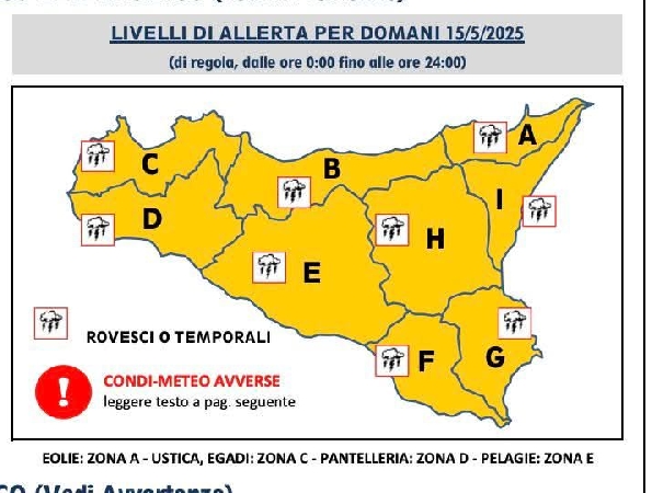 L’instabilità atmosferica è destinata a proseguire anche nella giornata di venerdì 16 maggio, con piogge e temporali che interesseranno soprattutto i settori centro-settentrionali della Sicilia. La situazione sarà costantemente monitorata dagli organi competenti.