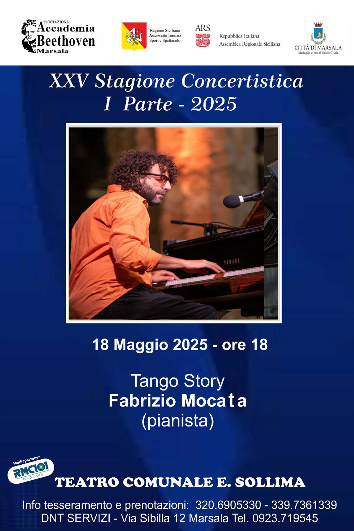 Domenica 18 maggio, alle ore 18.00, il Teatro Sollima di Marsala ospiterà “Tango Story”, il concerto del pianista e compositore Fabrizio Mocata, evento che segna la fine della prima parte della XXV Stagione Concertistica dell’Accademia Beethoven.