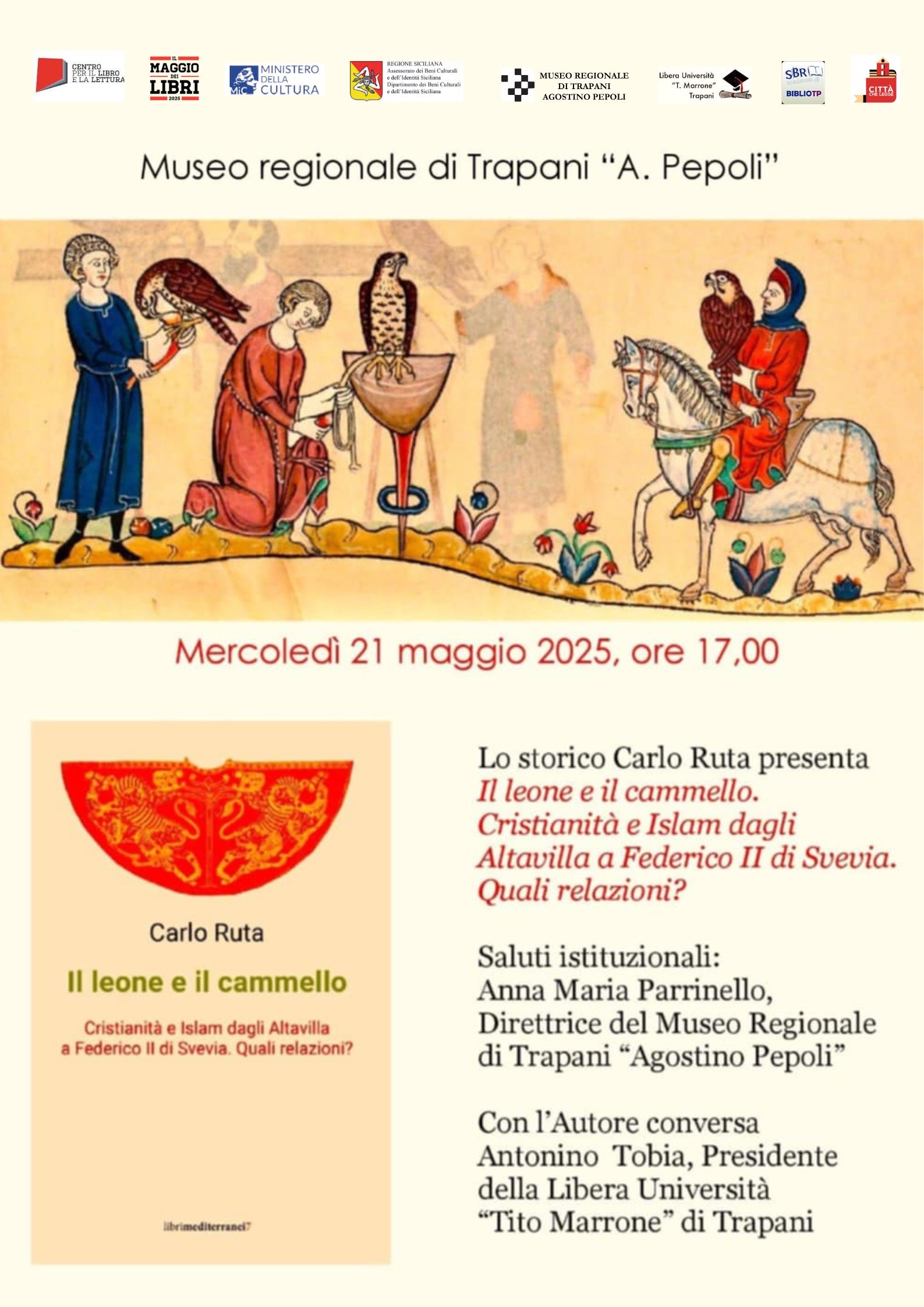 Il secondo evento si terrà mercoledì 21 maggio, sempre alle 17, con la presentazione del saggio Il leone e il cammello. Cristianità e Islam dagli Altavilla a Federico II di Svevia. Quali relazioni?, scritto dallo storico Carlo Ruta. A conversare con l’autore sarà Antonino Tobia, presidente della Libera Università “Tito Marrone” di Trapani, partner dell’iniziativa.