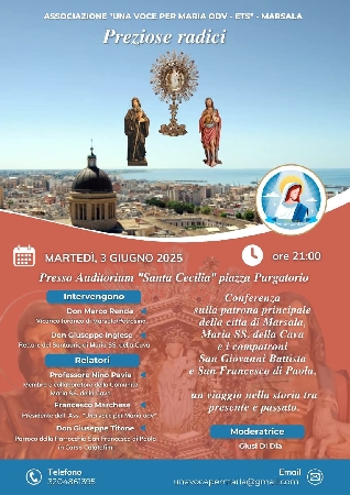 Il prossimo martedì 3 giugno 2025, Marsala si appresta a vivere un momento di grande significato spirituale e culturale con la conferenza “Preziose radici”, organizzata dall’Associazione "Una Voce per Maria ODV – ETS". L'appuntamento è fissato per le ore 21:00 presso l’Auditorium “Santa Cecilia” in Piazza Purgatorio (accanto Oviesse), un luogo simbolico che si trasformerà in spazio di riflessione e riscoperta dell’identità religiosa della città.