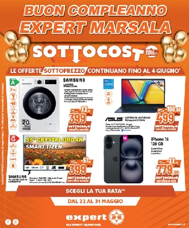 Expert Marsala compie due anni e celebra questo traguardo con una serie di promozioni rivolte ai propri clienti. Per l’occasione parte il "Sottocosto Anniversario", con offerte su tecnologia, elettrodomestici e articoli per la casa, disponibili fino al 4 giugno.