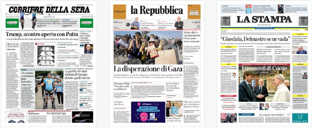 • Il Wall Street Journal scrive che gli Usa starebbero pensando a sanzioni contro la Russia. E Trump ha scritto su Truth che Putin «sta giocando col fuoco!». La risposta del portavoce del Cremlino Peskov è stata che per la tregua «naturalmente, c’è bisogno di tempo», accompagnata da pesanti minacce alla Germania, mentre nel Mar Baltico è in corso un’esercitazione militare della Marina russa