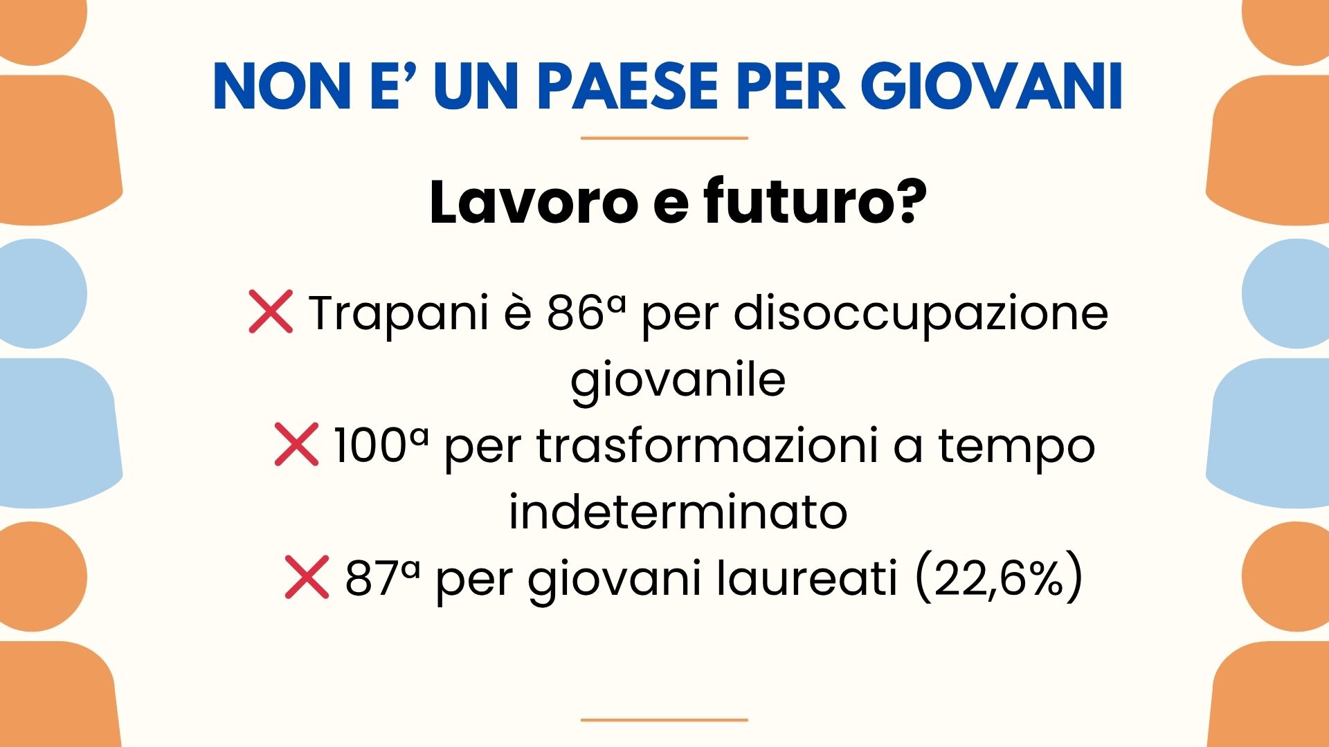 Anche la condizione dei giovani non è rosea. Trapani si colloca al 63° posto per qualità della vita degli under 35. Se da un lato i costi della vita sono bassi, dall’altro mancano stabilità, istruzione, occasioni culturali e opportunità di crescita.