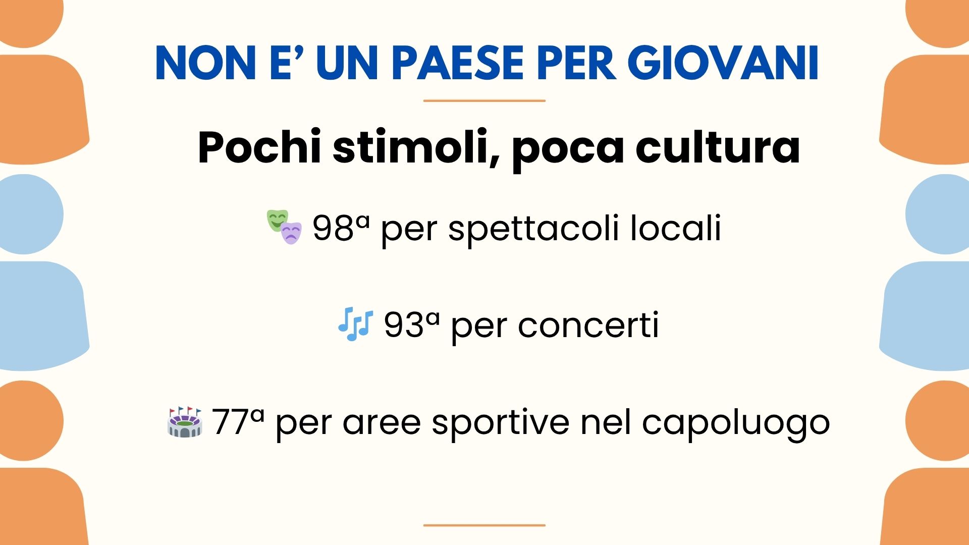 - 98esima per spettacoli locali e 93esima per concerti: un segno di scarsissima offerta culturale e ricreativa.