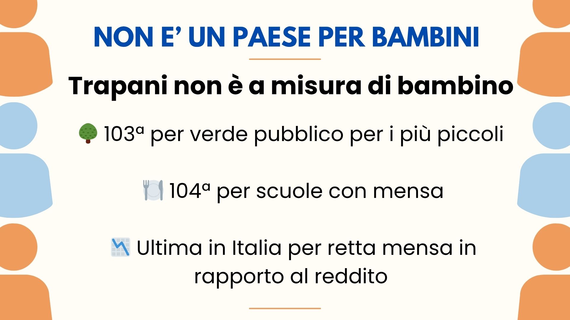 La situazione dei più piccoli è particolarmente grave. Trapani si piazza 106esima su 107 province per qualità della vita dei bambini. A incidere sono soprattutto l'assenza di servizi essenziali, i costi sproporzionati rispetto al reddito e i livelli preoccupanti di disagio sociale.