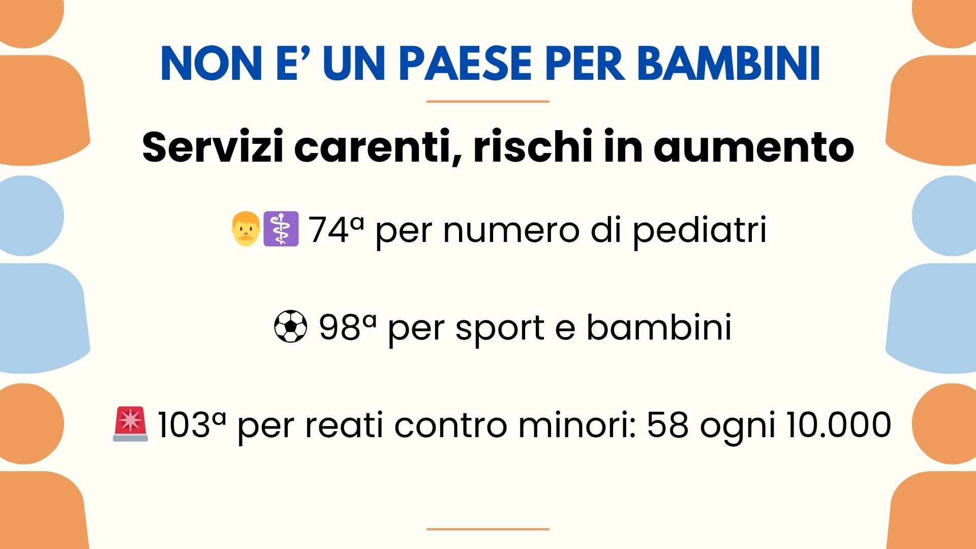 - 91esima per spesa sociale destinata a famiglie e minori, segno che l’investimento pubblico per i più piccoli è ancora insufficiente.