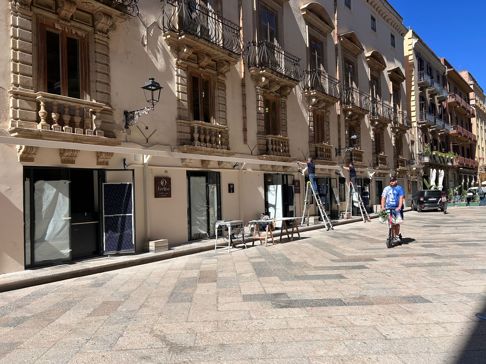 Un rinomato esercizio pubblico, leggasi bar gelateria, ha deciso di installare sulla facciata settecentesca, tardo barocca, una copertura per ombreggiare i suoi clienti e l’area di suolo pubblico che ha in concessione dal Comune. Al posto dei vecchi ombrelloni una più funzionale e ampia tenda che, però, trova ancoraggio sul paramento murario e poco al di sotto dei mensoloni dei balconi. Una striscia bianca di fissaggio spezza l’alternanza di aggetti e rientranze, di chiari oscuri, di articolazioni e decorazioni architettoniche che sono tipiche del barocco e del barocco siciliano in particolare. A lavori terminati, semmai verranno completati, la copertura finirebbe con il compromettere l’aspetto esteriore del palazzo, sia dal punto di vista paesaggistico, sia dal punto di vista architettonico, rompendo anche il delicato equilibrio prospettico che si chiude su palazzo Cavarretta.