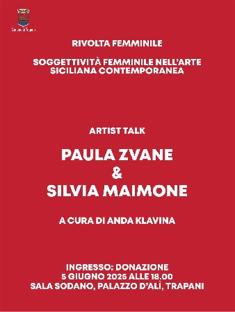 Il 5 giugno alle ore 18:00, la Sala Sodano di Palazzo d'Alì a Trapani ospiterà un nuovo incontro della rassegna Rivolta Femminile: la soggettività femminile nell’arte siciliana contemporanea, con la partecipazione delle artiste Paula Zvane e Silvia Maimone.
