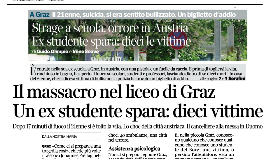 • Strage di studenti in Austria. Un giovane di 22 anni ha sparato all’impazzata nella sua ex scuola. Per ora si contano 11 morti