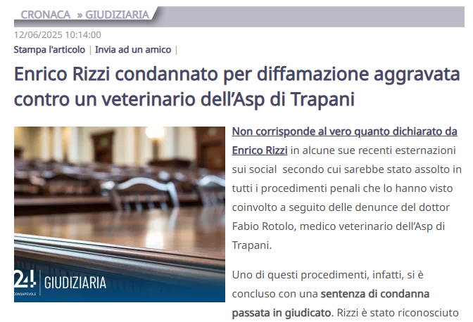 in riferimento all'articolo apparso su Tp24  ed afferente la vicenda giuridica che ha visto contrapposti il sig. Rizzi ed il dott. Fabio Rotolo è d'obbligo specificare che la vicenda alla quale si fa riferimento è invero risalente nel tempo ed autonoma e distinta da quella per cui Ella aveva già inserito un articolo che aveva riguardo all'assoluzione conseguita in grado di appello dal sig. Rizzi.
