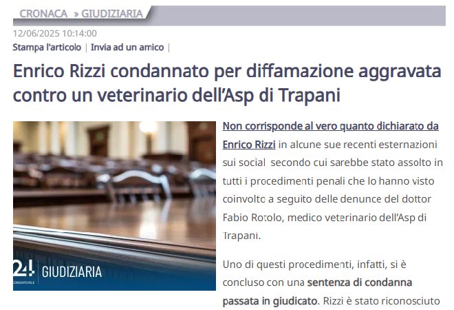 in riferimento all'articolo apparso su Tp24 ed afferente la vicenda giuridica che ha visto contrapposti il sig. Rizzi ed il dott. Fabio Rotolo è d'obbligo specificare che la vicenda alla quale si fa riferimento è invero risalente nel tempo ed autonoma e distinta da quella per cui Ella aveva già inserito un articolo che aveva riguardo all'assoluzione conseguita in grado di appello dal sig. Rizzi.