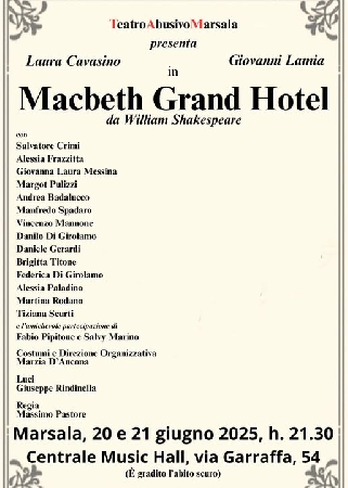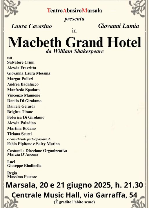 Il 20 e 21 giugno 2025, alle ore 21:30, al Centrale Music Hall di via Garraffa 54 andrà in scena Macbeth Grand Hotel, un adattamento originale ispirato all’opera di William Shakespeare, firmato da Teatro Abusivo Marsala e diretto da Massimo Pastore.