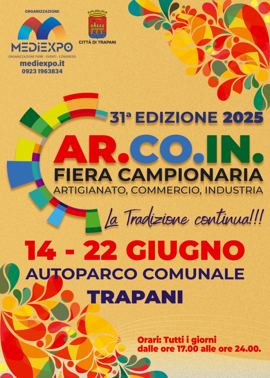 TRAPANI - Dal 14 al 22 giugno 2025 l’autoparco comunale di Trapani ospita la 31ª edizione della Fiera AR.CO.IN, tra le più importanti del Sud Italia. Organizzata da Mediexpo, propone esposizioni, eventi, street food e spettacoli, con settori che spaziano dall’artigianato all’industria. La fiera sarà aperta ogni giorno dalle 17:00 alle 24:00. Ingresso gratuito nei giorni feriali fino alle 20, poi biglietto a 2,50 euro (ridotto per i bambini). Info: Mediexpo 0923.1963834.