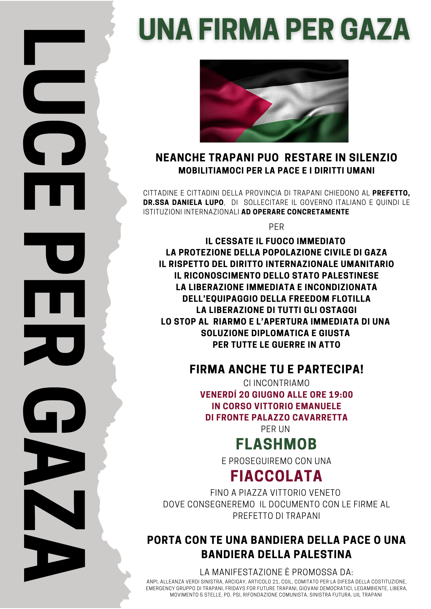 Venerdì 20 giugno alle ore 19:00, Trapani si prepara a illuminarsi per Gaza con una manifestazione che partirà da Corso Vittorio Emanuele, davanti a Palazzo Cavarretta, per poi concludersi in Piazza Vittorio Veneto con una fiaccolata preceduta da un flashmob.