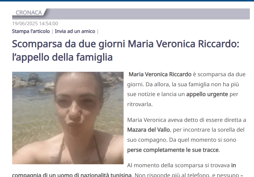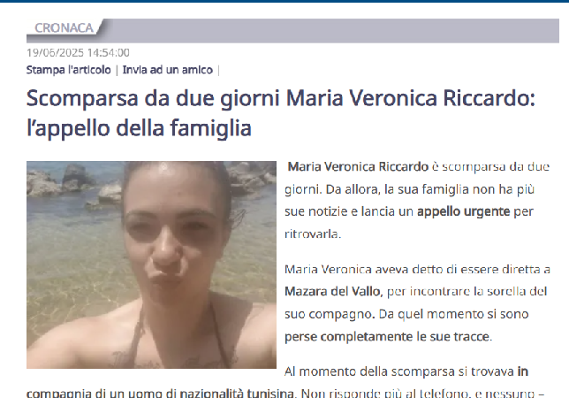 È stata ritrovata Maria Veronica Riccardo, la giovane di cui non si avevano più notizie da due giorni a Mazara del Vallo. A comunicarlo è la famiglia con un messaggio di sollievo e riconoscenza: “Con immensa gratitudine vi informiamo che nostra sorella ci ha chiamati ed è stata ritrovata.”
