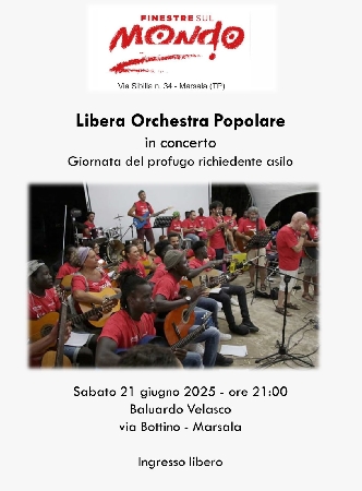 Sabato 21 giugno 2025, alle ore 21:00, presso il Baluardo Velasco in via Bottino a Marsala, la Libera Orchestra Popolare sarà in concerto in occasione della Giornata del profugo richiedente asilo.