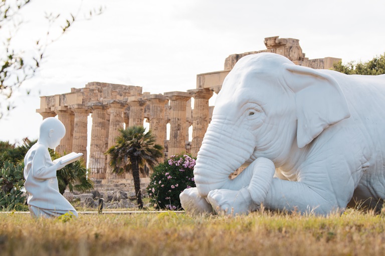 Sono creature complesse – rinoceronti sovradimensionati, gorilla che ci osservano in silenzio, da lontano, struzzi pop, coleotteri, bambini in equilibrio tra cranî fossili –, testimoni muti ma eloquenti di un’umanità smarrita che sta ancora cercando le sue tracce. E in un esempio di resilienza ecologica come è il Parco di Selinunte - luogo dove il tempo non ha distrutto, ma trasformato - trovano uno spunto in più per avviare un nuovo racconto che affronta i grandi temi inevasi del nostro tempo: la difesa dell’ambiente, un’umanità sempre più lontana dal pianeta, senza memoria.