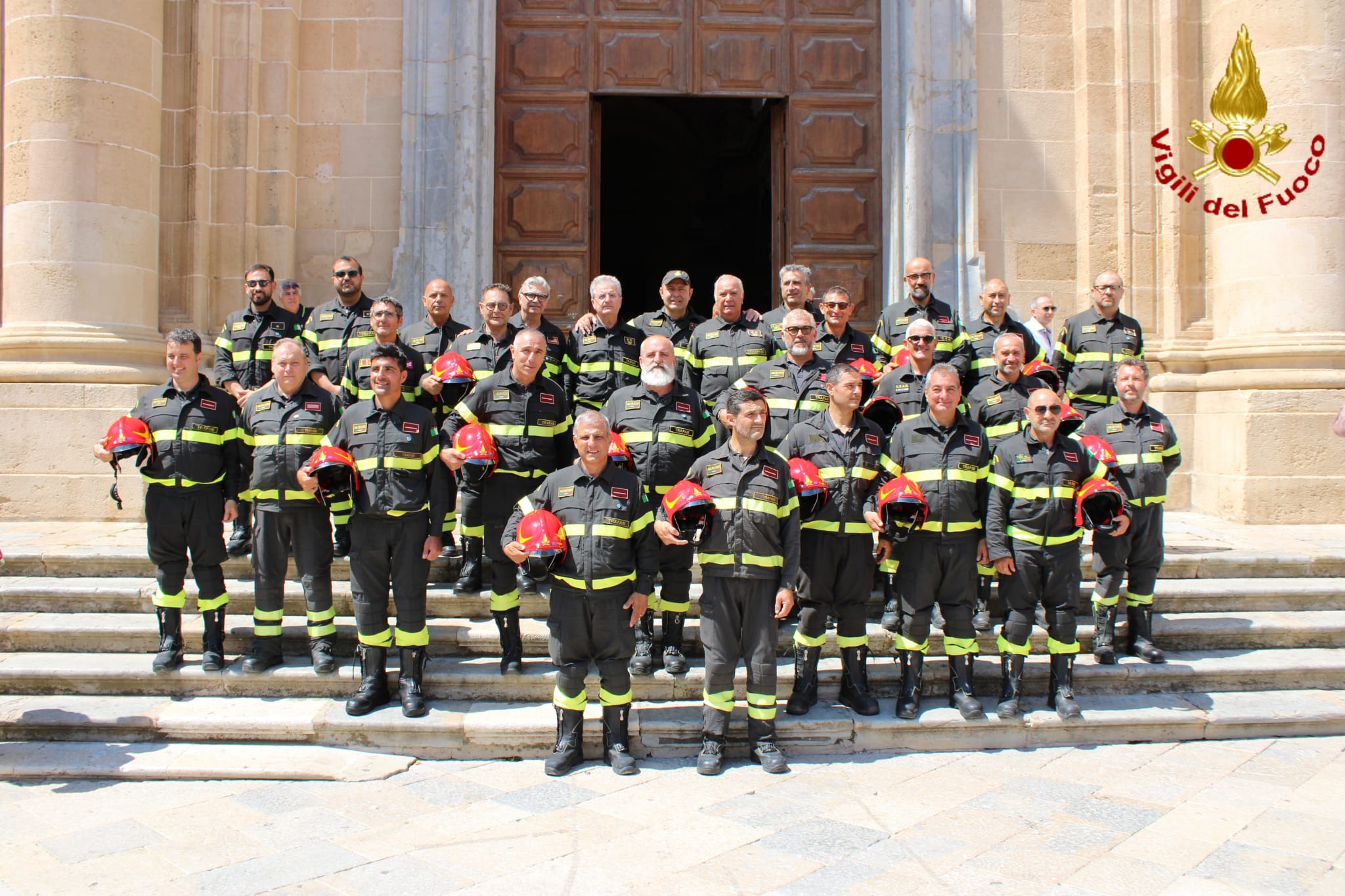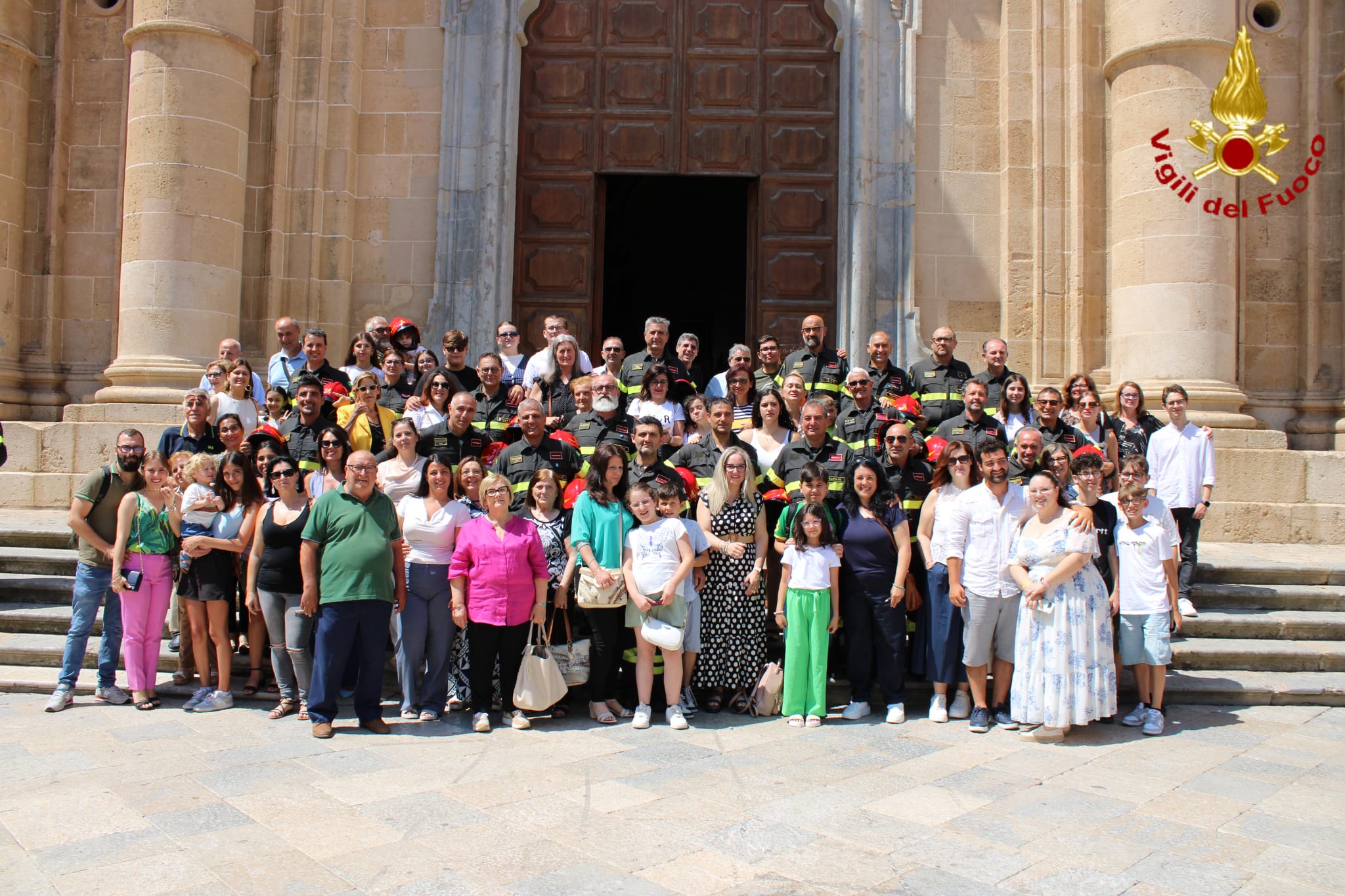 Simbolicamente anche il Vescovo Giurdanella ha ricevuto, dalle mani del Comandante, un crest raffigurante l'elmo rosso dei pompieri. Alla fine foto di gruppo con il Vescovo, il Sindaco Grillo e il Comandante e fuori sul sagrato della Chiesa Madre la foto di gruppo con i familiari dei neo capisquadra.
