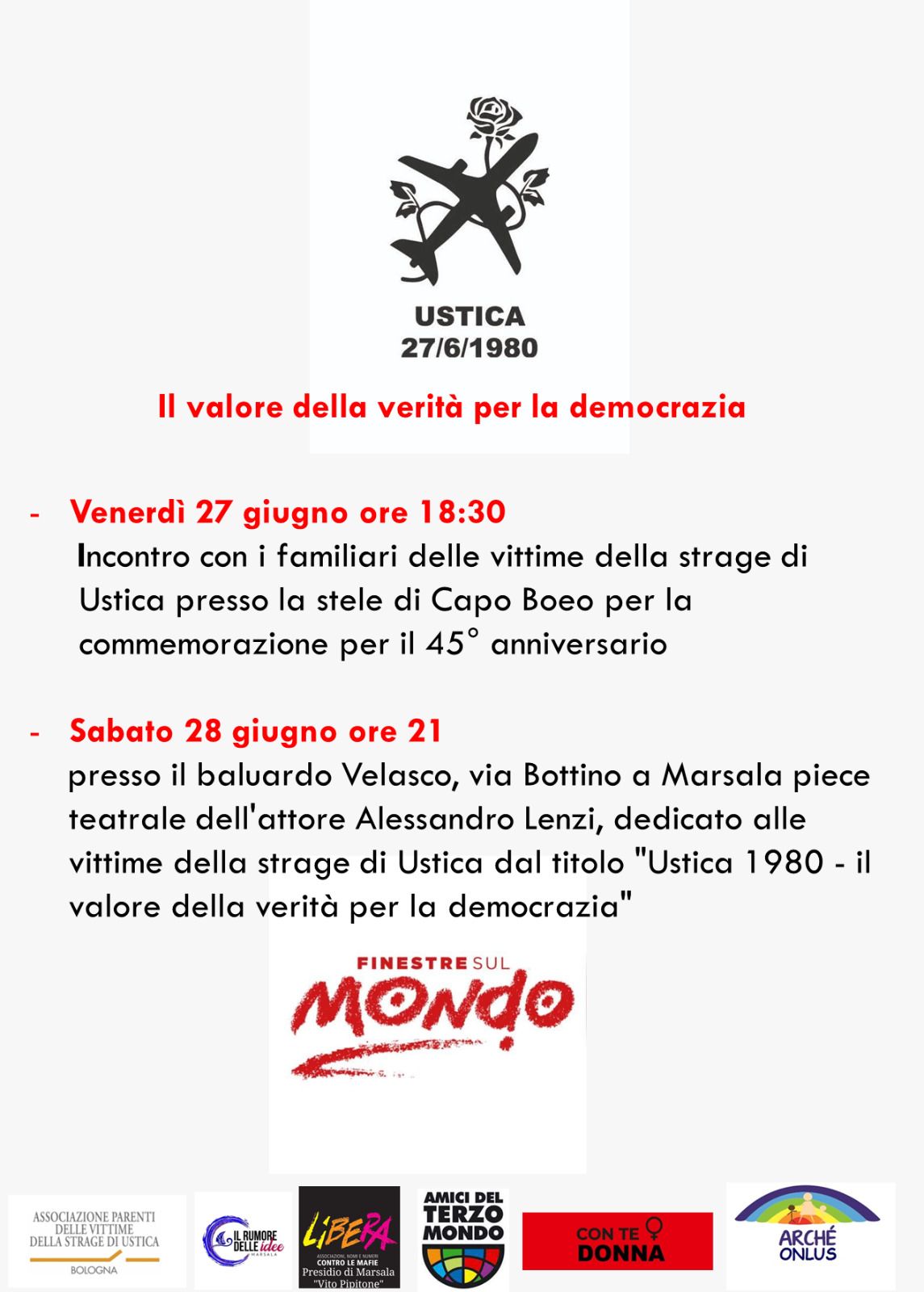Al Baluardo Velasco (via Bottino, Marsala), l’attore Alessandro Lenzi porterà in scena il monologo teatrale “Ustica 1980 – Il valore della verità per la democrazia”. Uno spettacolo intenso, scritto e interpretato dallo stesso Lenzi, che attraverso il linguaggio teatrale restituisce voce e dignità alle 81 vittime. Le iniziative marsalesi si inseriscono all’interno del percorso “Finestre sul Mondo”, con il coinvolgimento di numerose associazioni del territorio: Libera, Amici del Terzo Mondo, Il Rumore delle Idee, Arché Onlus, Con Te Donna, Raizes e altri.