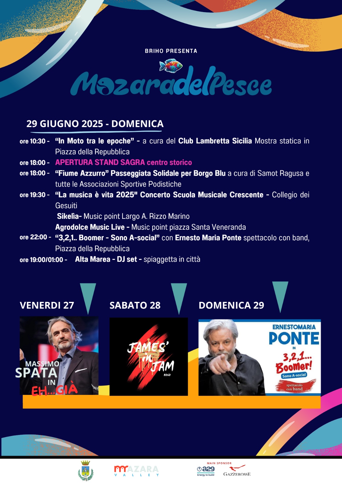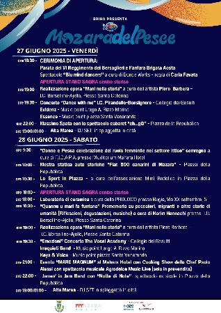 La manifestazione sarà inaugurata venerdì 27 giugno alle ore 18:30 con la parata della Fanfara dei Bersaglieri, cui seguiranno l’esibizione di danza della coreografa Carla Favata, l’apertura degli stand e uno spettacolo di cabaret in Piazza della Repubblica alle ore 22:00 con Massimo Spata. Per tre giorni, visitatori e cittadini potranno godere di degustazioni, spettacoli e momenti aggregativi con il pesce di Mazara del Vallo protagonista indiscusso.