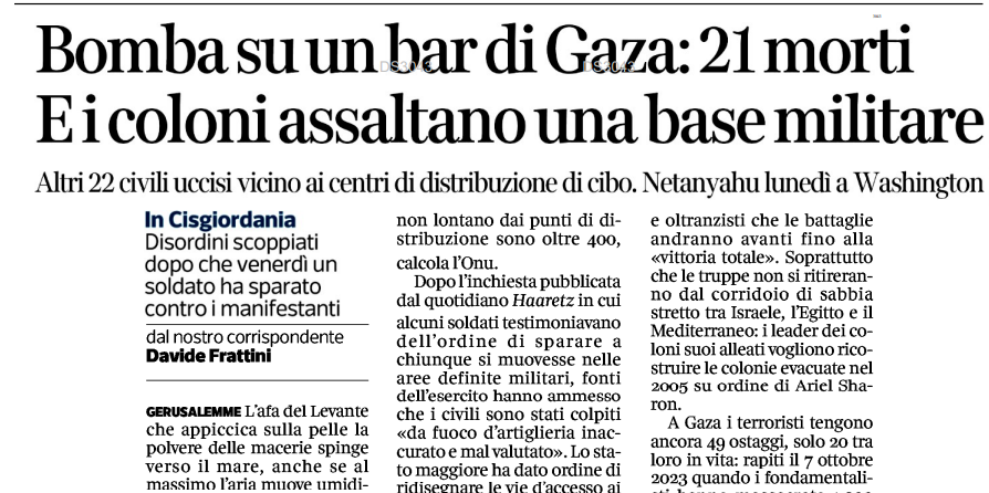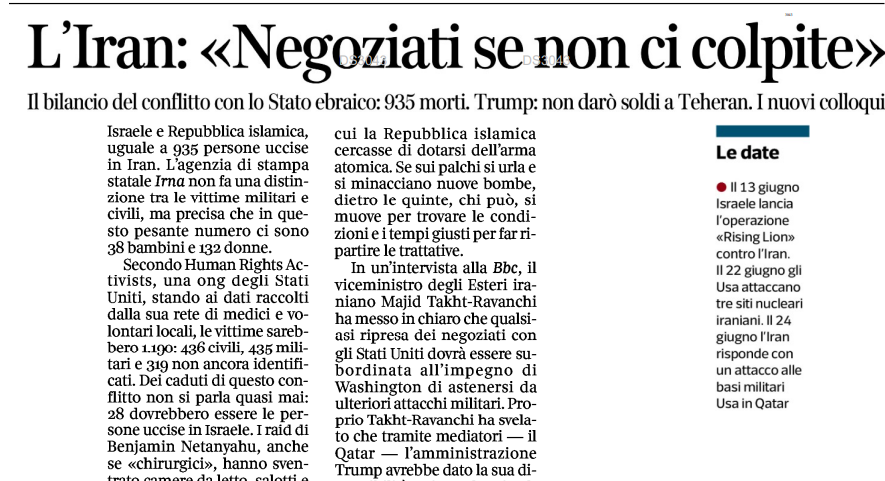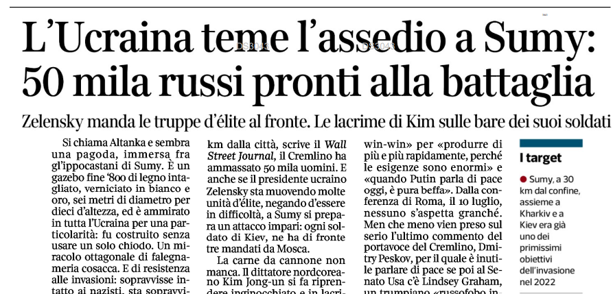 • Putin vuole conquistare Sumy. Avrebbe ammassato 50 mila soldati vicino alla città ucraina. Ma Zelens’kyj ha detto che non ce la sta facendo • In Russia per assemblare i droni nelle fabbriche del Tatarstan si reclutano operaie africane, provenienti da Paesi «amici» • Kim Jong-un che si è fatto riprendere in ginocchio e in lacrime davanti alla bara di un soldato nordccoreano morto nella guerra russo-ucraina • Stando a immagini satellitari, in Iran è già iniziata la ricostruzione del sito nucleare di Fordow. Le vittime della guerra «dei dodici giorni» sarebbero 1.190 • Trump ha firmato per la fine delle sanzioni imposte alla Siria • Oggi il commissario Ue al Commercio Šefčovič sarà a Washington per trattare sui dazi: l’Ue potrebbe accettarli al 10 per cento, ma con esenzioni su farmaci, vini, semiconduttori e aerei commerciali • Trump e Macron sono sempre meno graditi ai rispettivi concittadini, dicono i sondaggi • Trump ha lanciato i profumi Victory 45-47. Una boccetta costa 249 dollari, ma chi ne compra due avrà uno sconto di 100 dollari • In Europa fa caldissimo. Massima allerta in Spagna, Francia, Portogallo e Grecia. E in Italia non va meglio. In Sicilia e in Liguria è stato vietato lavorare all’aperto • A Bardonecchia il rio Fréjus è esondato. Come due anni fa, un’enorme onda nera ha invaso le strade del paese. Morto un uomo di 70 anni. Cogne di nuovo isolata per frane • È stata disposta una perizia psichiatrica per Chiara Petrolini. La giovane, 21 anni, è accusata di aver fatto morire i suoi due figli appena partoriti, e di averli poi seppelliti nel giardino di casa • Grillo Jr. ha ribadito la sua innocenza per lo stupro di cui è accusato. Oggi la requisitoria si concluderà con la richiesta delle pene • Continua la guerra dei narcos che sta sconvolgendo il Messico. Ventotto i morti solo in questo fine settimana. Alcuni avevano la testa mozzata • Angela Merkel ha attaccato Friedrich Merz. All’ex cancelliera non va giù la decisione del ministero degli Interni di respingere i richiedenti asilo alla frontiera: «Ci sono delle procedure» • Il Cdm ha approvato il decreto flussi per facilitare la migrazione regolare. Nei prossimi tre anni sono previsti 500 mila nuovi ingressi • A Milano ieri mattina l’insegna della Torre Hadid con il logo Generali è collassata, ma fortunatamente senza cadere dalla cima del grattacielo. Non ci sono stati feriti • Banca Mediolanum esce da Mediobanca e avvia la cessione del 3,5 per cento. Un punto a favore di Mps • YouTube aumenterà da 13 a 16 anni l’età minima per fare dirette streaming senza l’accompagnamento di un adulto • La Rai è pronta a traslocare il Festival. L’ad Giampaolo Rossi ha detto che «se si riuscirà a portare a termine un accordo col comune di Sanremo vantaggioso per entrambi, bene. Altrimenti la Rai andrà altrove» • A Wimbledon Fognini è stato battuto da Alcaraz in 5 set. Arnaldi e Berrettini sono stati eliminati. Oggi giocano Sinner-Nardi. E poi Cocciaretto, Musetti, Bronzetti, Sonego e Cobolli • Il Telegraph scrive che re Carlo vuole che ai suoi funerali Harry cammini a fianco del fratello William • Oggi la corte d’appello di Algeri pronuncerà il verdetto sullo scrittore franco-algerino Sansal, 80 anni, che rischia 10 anni di carcere per «attentato all’unità nazionale» (per un articolo) • Santos Cerdán, ex numero 3 del partito di Sánchez, è finito in carcere. È indagato per associazione a delinquere, corruzione e traffico di influenze • In Cile una candidata comunista ha vinto le primarie della sinistra. Si chiama Jeanette Jara e ha 51 anni • È indagata per corruzione l’assessora siciliana per il Turismo Elvira Amata • A Firenze una ragazza di 14 anni ha ferito con un coltello lungo 22 centimetri cinque poliziotti intervenuti per sedare una lite. È stata arrestata per tentato omicidio • Daniel Nilsson, valletto del programma di Paolo Bonolis Avanti un altro, è stato arrestato per violenze sulla compagna. L’ha schiaffeggiata per strada a Cervinia • Al Mondiale per club l’Inter è stata eliminata agli ottavi, sconfitta dai brasiliani del Fluminense per 2 a 0. L’Al-Hilal di Inzaghi ha eliminato il Manchester City per 4 a 3. Oggi gioca la Juventus • Sono morti il giornalista sportivo Raffaele Della Vite (89 anni) e il politico lucano Nicola Savino (88)