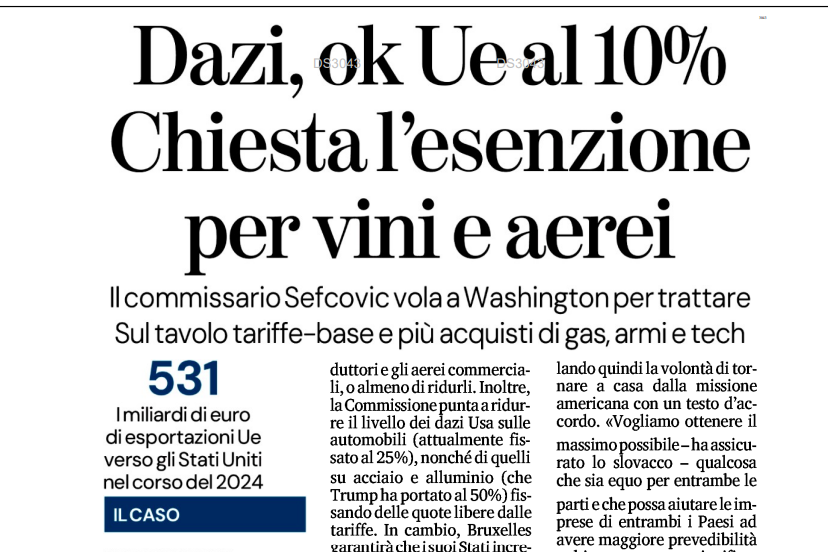 Titoli Corriere della Sera: Ecco il piano Ue sul tavolo di Trump / per limitare i dazi la Repubblica: Mattarella. / nelle carceri / è allarme La Stampa: Putin, la doppia tenaglia / dall’Ucraina all’Ungheria Il Sole 24 Ore: Dollaro, il semestre peggiore dal ’73 Avvenire: L’incubo delle armi Il Messaggero: Lavoro, aumentano gli stranieri Il Giornale: Grillo Jr. piange / Il pm: colpevoli Leggo: «Carceri, un’emergenza sociale» Qn: Mattarella, allarme carceri / «Fermare i suicidi in cella» Il Fatto: «Eravamo le vittime, / ora siamo i colpevoli» Libero: Il soviet della cassazione La Verità: Sulla filmopoli del Pd / ora si indaga per truffa Il Mattino: Imprese e-commerce, Napoli prima il Quotidiano del Sud: Mattarella: «Fermate / i suicidi in carcere» il manifesto: Non è / permesso Domani: Dazi, Big Tech e spese militari / I favori del mondo a Trump