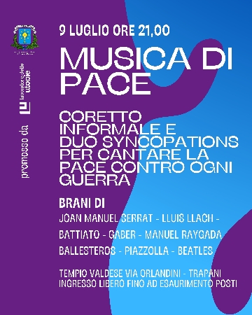 Il 9 luglio alle 21.00, al Tempio Valdese di Trapani in via Orlandini, si terrà “Musiche di Pace”, appuntamento organizzato dalla Chiesa Evangelica Valdese di Trapani e Marsala insieme al Laboratorio delle Utopie APS.