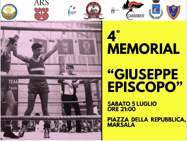 Sabato 5 luglio a partire dalle ore 20:30 si terrà in Piazza della Repubblica a Marsala il IV° Memorial Giuseppe Episcopo "Boxe sotto le Stelle". Divenuta manifestazione fissa dell'estate marsalese, sul Ring allestito in piena piazza "Loggia", di fronte la Chiesa Madre del centro lilibetano, l'ASD Marsala Boxe ha organizzato l'evento grazie sia al patrocinio della Città di Marsala che nell'ambito del progetto promosso dall'ARS "Sport e Legalità". Pino Episcopo, pluri Campione Italiano di Pugilato, affrontò gli avversari sia con la canotta del Gruppo Sportivo dei Carabinieri che con quella della storica palestra Marsala Ring riuscendo a raggiungere grandissimi risultati tra i dilettanti in questo affascinante Sport. L'alto comando dei Carabinieri, in ricordo del Campione lilibetano, ha autorizzato la famiglia Episcopo, all'utilizzo dei simboli dell'Arma e del Gruppo Sportivo all'interno della manifestazione, consolidando l'indissolubile legame tra i Carabinieri e la famiglia Episcopo. La serata vedrà diversi combattimenti nelle varie categorie tra i pugilisti della Marsala Boxe ed una selezioni di avversari provenienti da tutta la Sicilia.