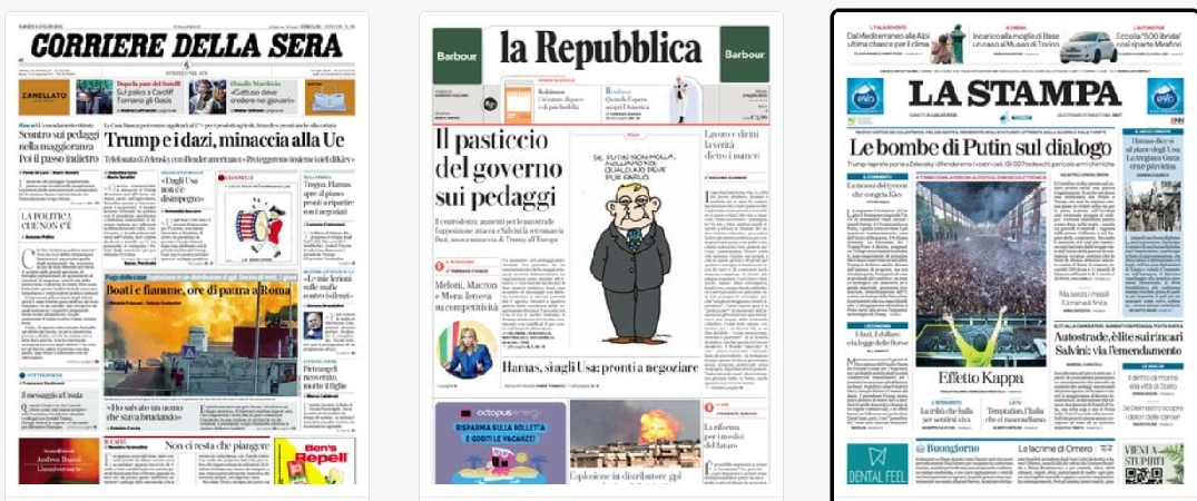 Titoli Corriere della Sera: Trump e i dazi, minaccia alla Ue la Repubblica: Il pasticcio / del governo / sui pedaggi La Stampa: Le bombe di Putin sul dialogo Il Sole 24 Ore: Clima, già colpito il 57 % delle aziende Avvenire: Campi e celle roventi Il Messaggero: La strage sfiorata Qn: Trump sente Kiev: vi riarmo / Sì di Hamas al piano Usa Il Fatto: Rai, riforma bloccata: multa Ue di 9 milioni Libero: Il Pd salva i compagni dai controlli fiscali La Verità: La soluzione anti caldo del Pd: / più cassa integrazione per tutti Il Mattino: Sud, crescita record dei porti il Quotidiano del Sud: Trump «riarma» Zelensky /Dazi, alta tensione Usa-Ue il manifesto: C’è posta per voi Domani: Dazi, l’ultima minaccia di Trump / Il Ft: sui prodotti agricoli il 17 per cento