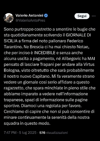 Attacco che ha portato l’Associazione siciliana della stampa con il Gruppo siciliano giornalisti sportivi aderenti all’Ussi ad esprimere esprimono "sconcerto e ferma condanna per le gravi e offensive dichiarazioni del presidente del Trapani Basket, Valerio Antonini, rivolte pubblicamente - attraverso un post social - al giornalista Federico Tarantino e al Giornale di Sicilia".