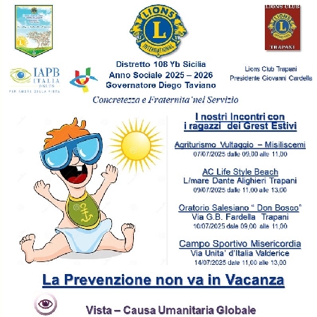 In questo contesto si inserisce l’iniziativa “La prevenzione non va in vacanza”, promossa dalla Fondazione IAPB Italia (Agenzia Internazionale per la Prevenzione della Cecità), in collaborazione con l’Unione Italiana Ciechi e Ipovedenti e il Lions Club Trapani. A partire da lunedì 7 luglio, l’attività coinvolgerà quattro Grest Estivi del territorio, con momenti informativi rivolti ai ragazzi, volti a promuovere la tutela della salute visiva attraverso semplici accorgimenti quotidiani.