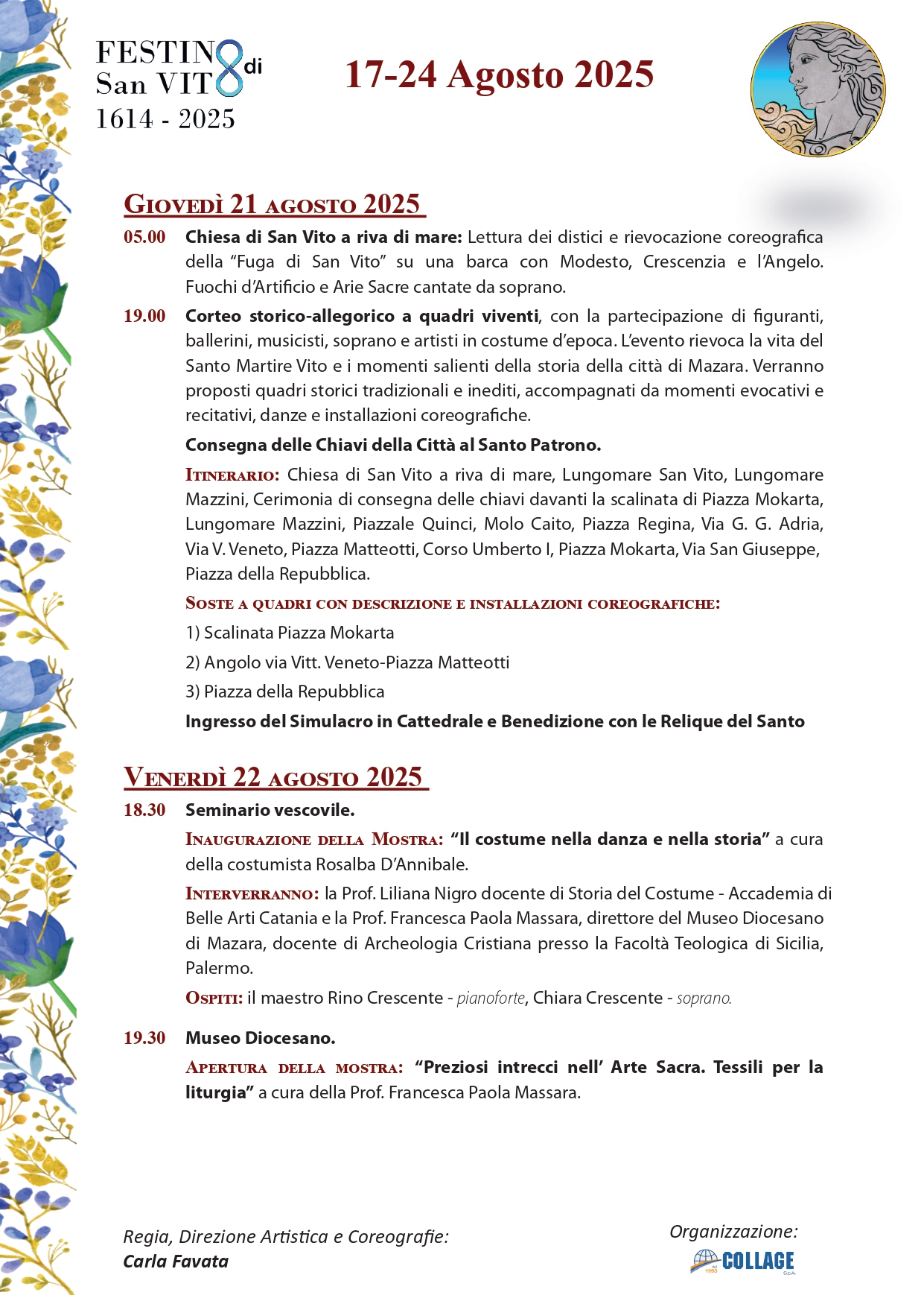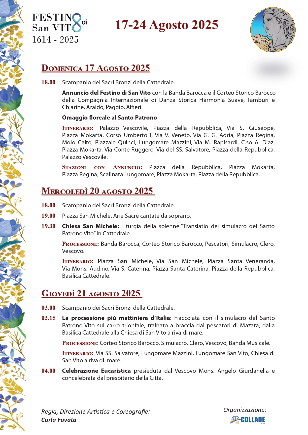 Il Festino di San Vito 2025 è realizzato grazie al sostegno della Regione Siciliana, del Comune e della Diocesi di Mazara del Vallo, del Libero Consorzio Comunale di Trapani, dell’Associazione Santi Patroni e del Museo Diocesano. L’obiettivo condiviso è quello di trasformare l’evento in un simbolo di identità collettiva, capace di raccontare Mazara attraverso la sua storia e i suoi valori, rafforzandone al tempo stesso l’attrattività culturale e turistica.