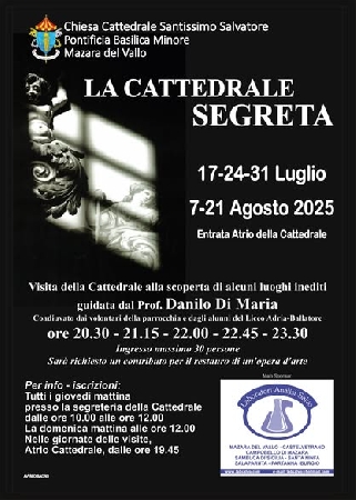Un viaggio nella storia, tra pietra e silenzio. A Mazara del Vallo, per sei serate estive, torna l’appuntamento con “La Cattedrale Segreta”: un percorso guidato alla scoperta degli angoli più nascosti della Chiesa Cattedrale del Santissimo Salvatore. Le date sono quelle del 17, 24 e 31 luglio, e del 7 e 21 agosto 2025, con turni serali ogni 45 minuti a partire dalle 20.30 fino alle 23.30.