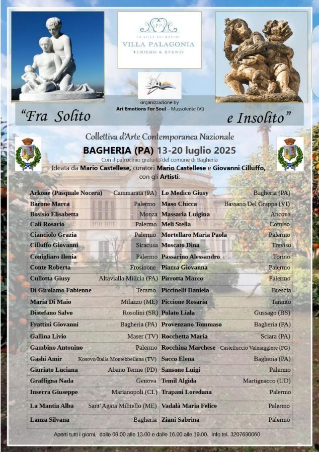Fino al 20 luglio, “Villa Palagonia” a Bagheria apre le sue porte a “Fra Solito e Insolito”, una collettiva d’arte contemporanea che mette in dialogo l’architettura visionaria della villa con le opere di 42 artisti provenienti dalla Sicilia e da diverse regioni d’Italia.