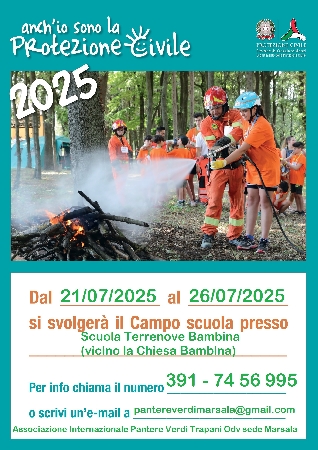Dal 21 al 26 luglio, presso la Scuola primaria di Contrada Terrenove Bambina a Marsala, si svolgerà la quindicesima edizione del progetto nazionale “Anch’io sono la protezione civile”, promosso dall’Associazione Internazionale Pantere Verdi Trapani ODV.
