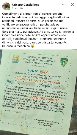 Nel post allega la foto del permesso rilasciato dal Comando di Polizia Locale di Trapani, che autorizza un consigliere comunale a parcheggiare in diverse aree cittadine, tra cui la litoranea Dante Alighieri, viale Regina Elena e piazza Dalla Chiesa. Il documento specifica però che l’autorizzazione è valida “nelle ore funzionali dell’ente” e deve essere esposta sul cruscotto.