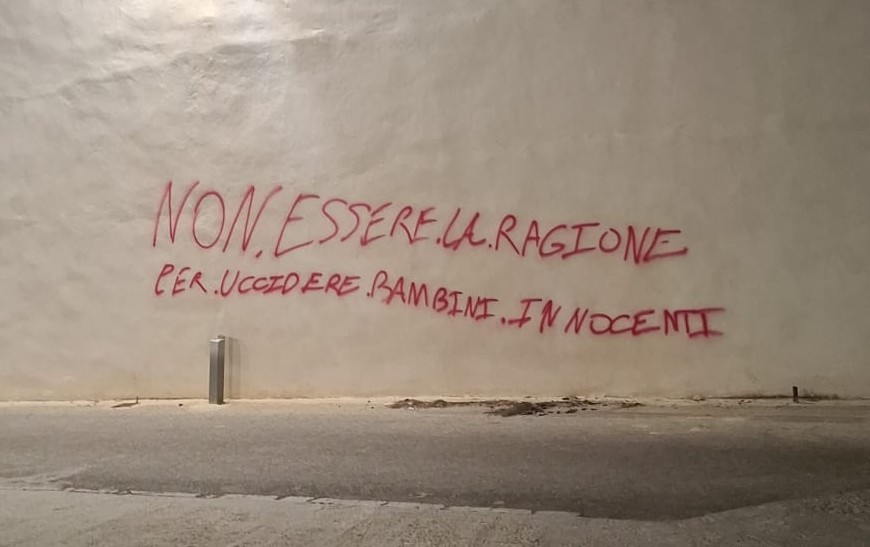 Un'altra scritta fa riferimento alle migliaia di persone e bambini che da mesi muoiono a Gaza: "Non essere la ragione per uccidere bambini innocenti".