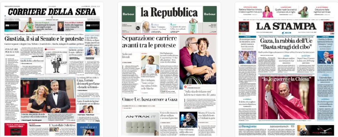 Titoli Corriere della Sera: Giustizia, il sì al Senato e le proteste la Repubblica: Separazione carriere / Anati tra le proteste La Stampa: Gaza, la rabbia dell’Ue / “Basta stragi del cibo” Il Sole 24 Ore: Dividendi, l’Europa corre (+10%) Avvenire: Inaccettabile Il Messaggero: Giustizia, la riforma va avanti Il Giornale: Ok alla separazione delle carriere Leggo: «Fine vita, la decisione è solo nostra» Qn: Giustizia, primo sì alla riforma / Carriere separate e due Csm Il Fatto: Salvini premio horror: / “Israele realtà pacifica” Libero: Un indagato al giorno / Sinistra ostaggio dei pm La Verità: Dopo Milano, le Marche: Pd alla sbarra Il Mattino: Giustizia, la riforma avanza il Quotidiano del Sud: Svolta sui pm, bluff sulle carceri il manifesto: Magistratura / dipendente Domani: Giustizia, passa la riforma peggiore / Dopo Sala indagato anche Ricci
