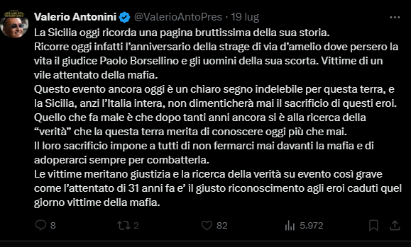 Nella sua nuova veste di leader maximo, Antonini si cimenta anche nello sport tipico di ogni politico siciliano: sfoggiare pensieri solenni in occasione delle commemorazioni delle vittime di mafia. E puntuale, il 19 luglio, data dell’attentato in cui vennero uccisi il giudice Paolo Borsellino e gli agenti della sua scorta, Antonini ha pubblicato un post su X, dal tono ispirato e pieno di parole come “verità”, “eroi”, “giustizia”, “sacrificio”: “La Sicilia oggi ricorda una pagina bruttissima della sua storia... L’Italia intera non dimenticherà mai il sacrificio di questi eroi... La ricerca della verità su un evento così grave è il giusto riconoscimento...”. E ancora: "Le vittime meritano giustizia e la ricerca della verità su evento così grave come l’attentato di 31 anni fa e’ il giusto riconoscimento agli eroi caduti quel giorno vittime della mafia".